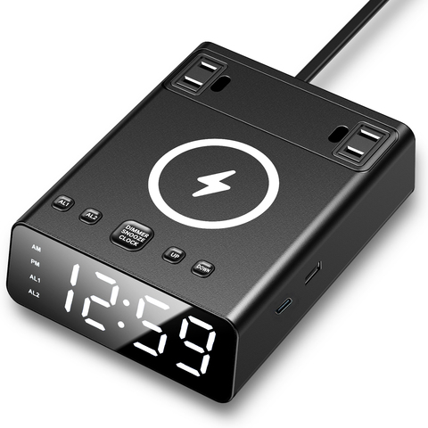 DC12 7-in -1 caricabatterie wireless tipo C porte di ricarica hub USB snooze sveglia digitale con presa presa a corrente alternata
